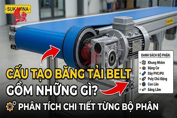 Tìm hiểu cấu tạo băng tải belt chi tiết từ khung, dây belt, motor đến con lăn. Phân tích kỹ thuật giúp bạn chọn đúng hệ thống băng tải.